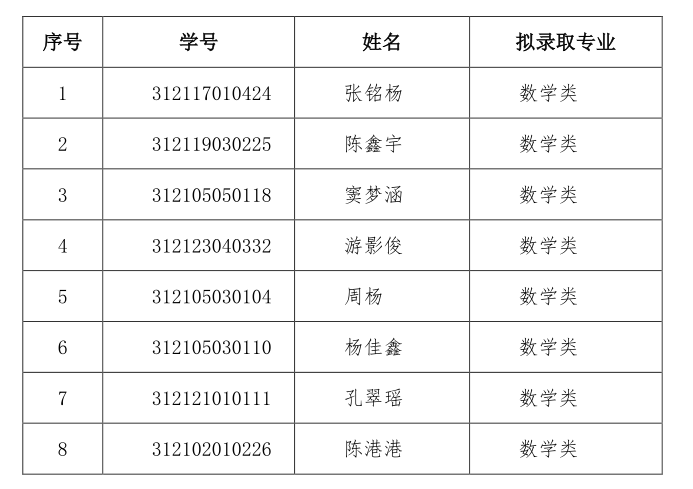 根据《河南理工大学转专业管理办法》和《开云kaiyun官网转专业实施细则》规定,经本人自愿申请、学院研究,拟同意以下8名同学转入开云kaiyun官网21级数学类进行学习,现将拟转入学生名单进行公示。
