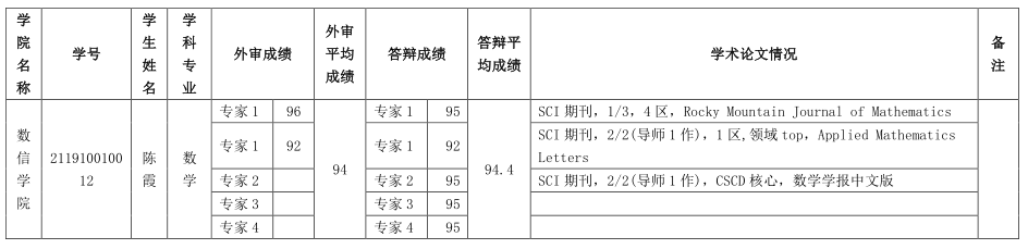 根据院学位分委员会推荐排名,现拟推荐陈霞(学术型)同学的学位论文参评河南省优秀硕士学位论文。该同学学位论文的外审成绩、答辩成绩和学术成果等信息如下。现将推荐结果予以公示,公示期为2022年9月22日-25日。对该推荐结果有异议者请于公示期内向学院反映。