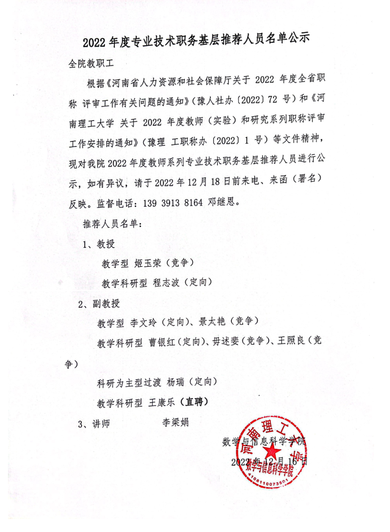 2022年度专业技术职务基层推荐人员名单公示