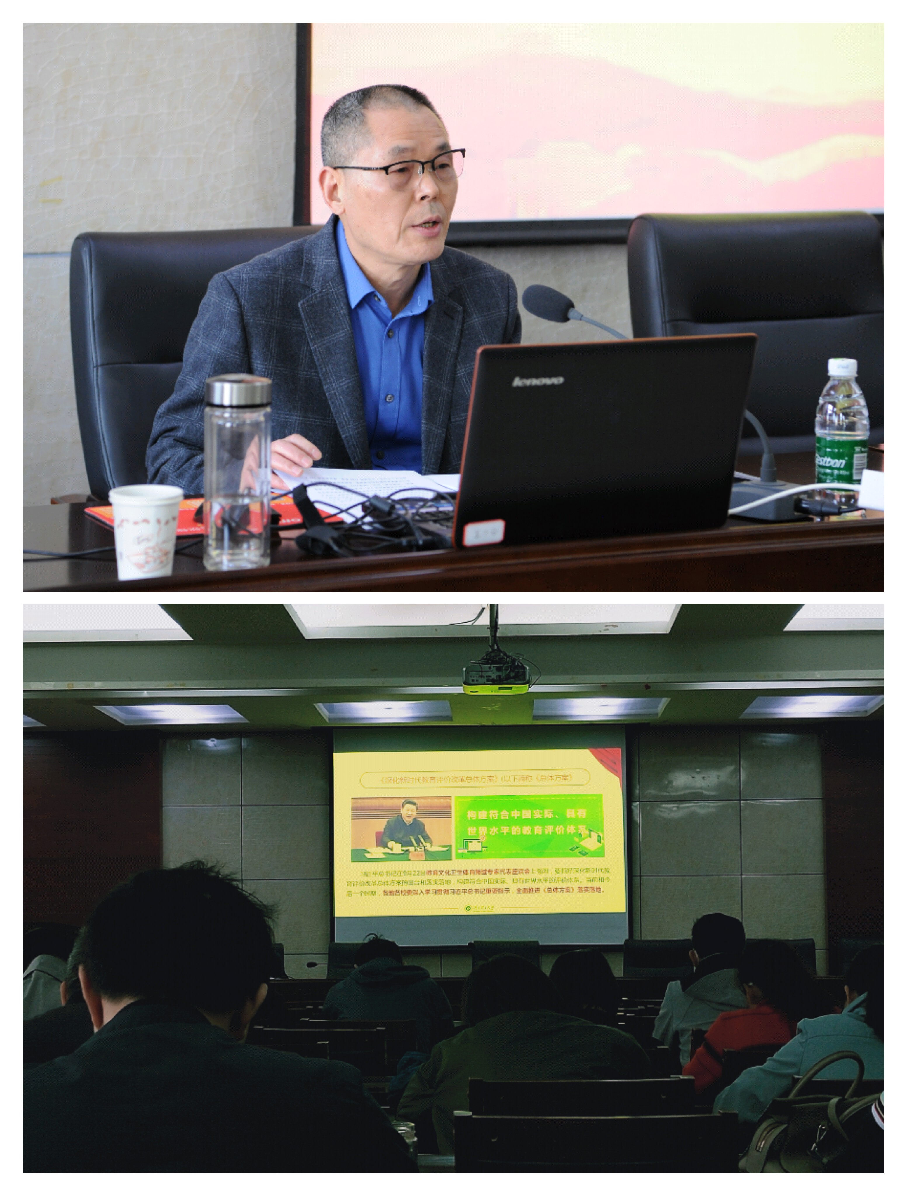 原保全首先让大家了解了《总体方案》出台的背景、过程和意义,教育是国之大计、党之大计,教育评价事关教育发展方向,是树立正确办学导向的指挥棒,也是提高现代教育治理能力的关键点。其次他又介绍了《总体方案》的基本定位、考虑和特点,坚持以立德树人为主线,以破“五唯”为导向,以五类主体为抓手,着力做到政策系统集成、举措破立结合、任务协同推进。接着他带领大家一起学习了《总体方案》的主要内容和精神。