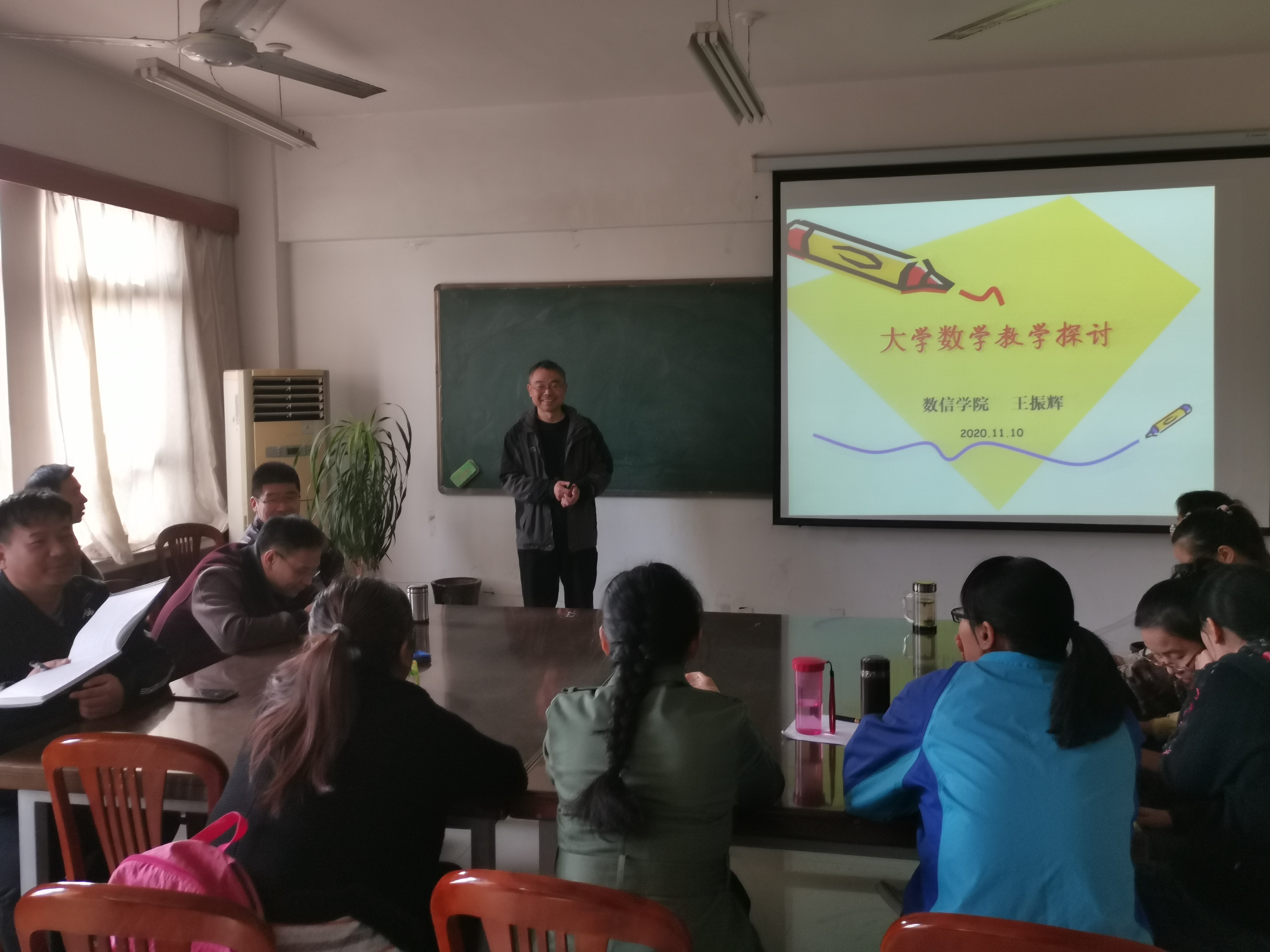 河南理工大学太行名师王振辉老师为数学与应用数学系的老师们做了《大学数学教学探讨》。王老师结合自己的教学实践,深入浅出讲述了大学数学课堂教学的基本组成,大学数学教学的几点看法,增强课堂教学效果的几点看法,提高课堂教学驾驭能力的几个方面,注重多种思维方式的培养,以人为本教书育人等六个方面。最后,正所谓“教学有法,教无定法”,王老师鼓励老师们积极探索,不断创新,“贵在得法”。