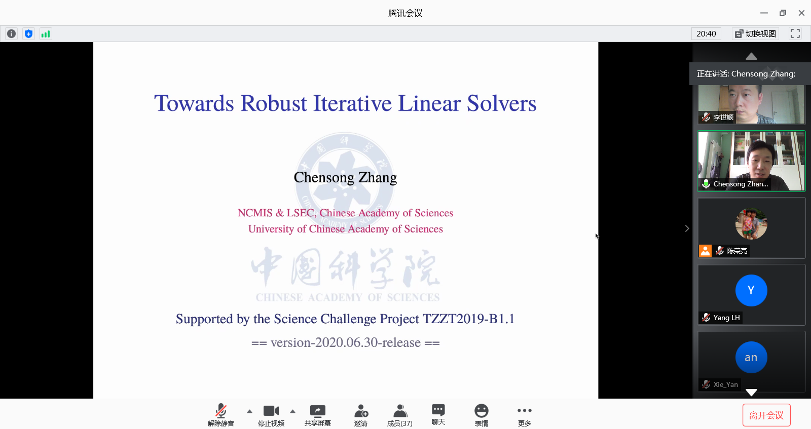 2020年7月3日上午,中国科学院数学与系统科学研究院计算数学所张晨松副研究员受邀为开云kaiyun官网师生做了题为“Toward Robust Iterative Linear Solution Methods”的学术报告。该报告以线上形式在腾讯会议平台进行。