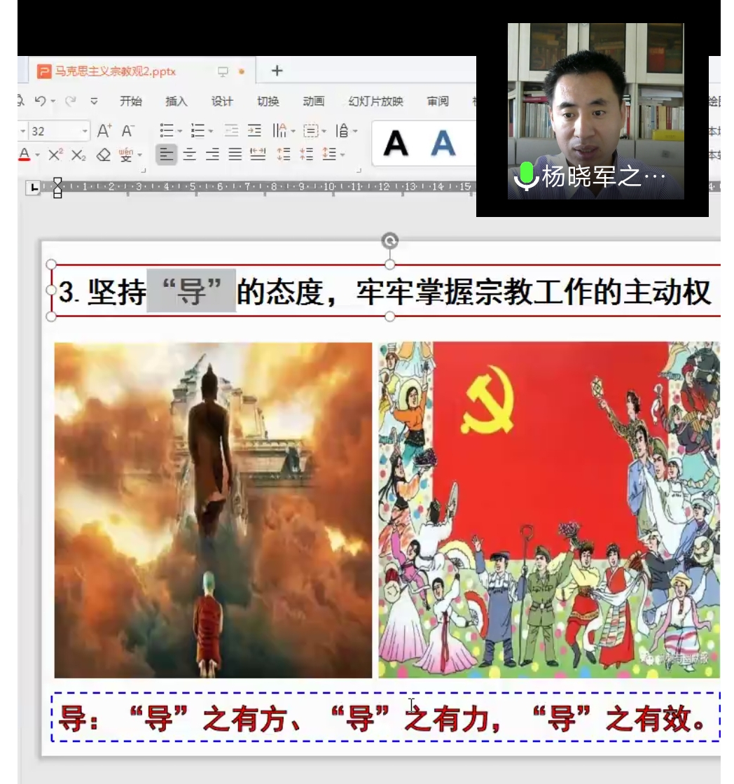 为加强中国特色社会主义宗教理论、党的宗教政策和国家有关法律法规的学习宣传,深化马克思主义宗教观教育。4月28日下午,开云kaiyun官网特邀请马克思主义学院杨晓军老师做了一堂以《马克思主义宗教观》为题的报告。鉴于疫情的特殊性,本次报告选择线上“腾讯会议”授课,学院全体研究生及辅导员聆听了报告。