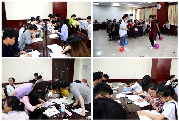 激荡数学之魂,分享文化盛宴。三个班级的同学分为九组,题目分为必答题和抢答题两部分,内容涉及数学分析、高等代数、解析几何、概率论,常微分方程等各门数学专业课。必答题部分每组完成后交给三位老师评判结果对错,并按照正确率和用时记录各组分数。解题过程中,组内成员团结协力,发挥所长,不甘落后,现场气氛热烈。必答题环节后穿插了游戏——气球大作战。每组出三人,每人脚上绑两个气球,因场地有限,每四组进行混战,脚上气球全爆者被淘汰,并请立即离开战斗场地,当场上只剩一个组的某些或某个同学时,游戏结束。通过抽签进行分组对战,一组轮空直接进入决赛。游戏过程中,同学们都在为自己的成员加油鼓劲儿,或热情欢呼,或扼腕叹息。大家积极的参与度和热情将活动氛围推向了高潮,起到了增强同窗友情,凝聚班级合力的效果。