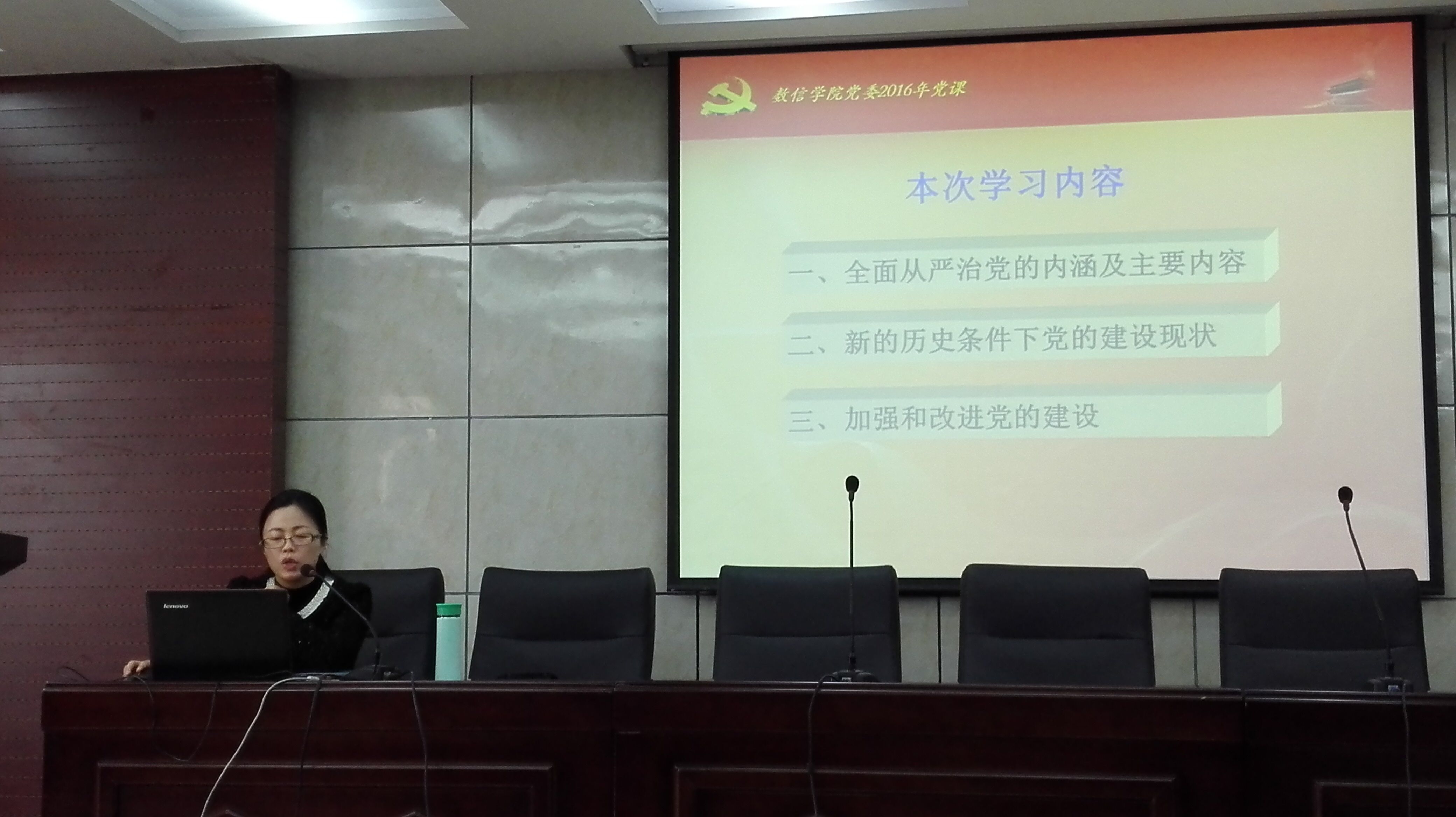 李慧敏从苏联亡党亡国的历史教训和“全面从严治党”的提出背景讲起,围绕全面从严治党的内涵及主要内容、新的历史条件下党的建设现状、如何加强和改进党的建设等三个方面进行了阐述。她强调基层党组织是党的根基,在改进党的作风建设中起着重要作用,学院党委委员和党支部书记要统一思想、深化认识,切实承担起全面从严治党的主体责任;全体师生党员要坚定理想信念,严守政治纪律、严明政治规矩,始终保持共产党员的先进性和纯洁性,真正把全面从严管党治党放在心上、扛在肩上、落实在行动上。
