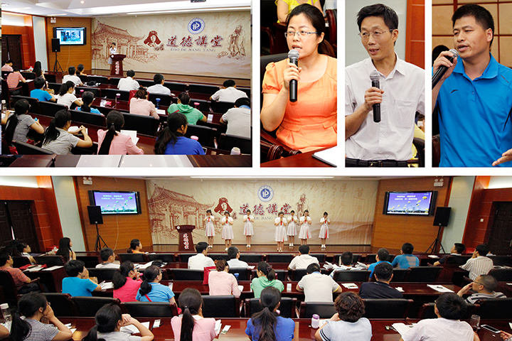 道德讲堂共分为“做自省、学模范、讲故事、诵经典、谈感受、唱歌曲”6个环节。活动在“做反省”中拉开序幕,全体教师在主持人的引导下做反躬自省;在“学模范”环节观看了“感动中国十大人物”“当代雷锋”郭明义和“最美女教师”张丽莉的先进事迹;在“讲故事”环节,聆听了我校省“五一劳动奖章”获得者、省师德标兵、土木学院教师王钦亭的先进事迹;在“诵经典”环节,大家在宣讲人员的带领下诵读了“严慈、严谨、严格”学校教风和“天行健,君子以自强不息;地势坤,君子以厚德载物”等中国传统道德经典;在“谈感受”环节,教师代表分享了学习心得和道德感悟,并就如何加强道德建设发表了自己的看法;活动在手语表演《感恩的心》的“唱歌曲”环节落下帷幕。