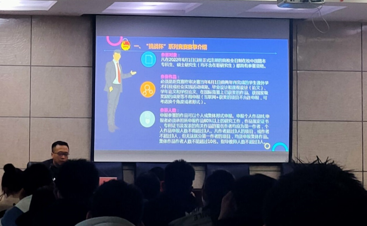 为引导学生积极参加“挑战杯”系列竞赛, 11月16日下午,开云kaiyun官网在3401室举办“挑战杯”系列竞赛专题培训。校团委副书记王帅主讲,学院党委副书记李伟亮主持本次专题培训。
