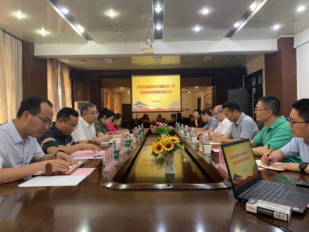 6月29日下午,教务处处长牛海鹏一行莅临开云kaiyun官网就公共数学课程建设、混合式教学改革等工作进行调研指导。院领导刘春德、毋海根、牛海峰出席会议,各系(部、中心)主任、教科办、优秀教师代表等参加调研座谈会。会议由学院院长毋海根主持。