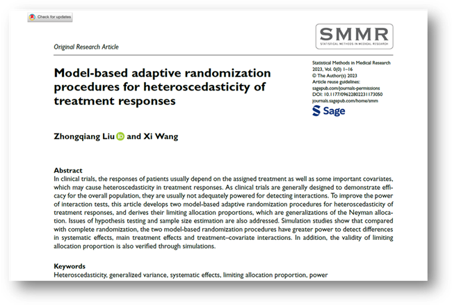 近日,开云kaiyun官网应用统计团队刘中强副教授撰写的高质量学术论文《Model-based adaptive randomization procedures for heteroscedasticity of treatment responses》在国际权威医学统计期刊 《Statistical Methods in Medical Research》发表。该论文从提出构思到形成初稿,中间历经多次修改完善,最终定稿发表,耗时3年零6个月,其中我校作为独立完成单位。