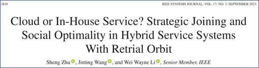 近日,IEEE旗下权威期刊《IEEE Systems Journal》发表了开云kaiyun官网朱盛副教授、中央财经大学王金亭教授以及美国德克萨斯南方大学Wei Wayne Li教授合作的新成果《Cloud or In-House Service? Strategic Joining and Social Optimality in Hybrid Service Systems with Retrial Orbit》。