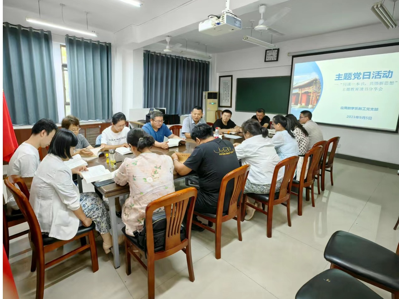 本网讯(通讯员 李自来)为推动学习贯彻习近平新时代中国特色社会主义思想主题教育走深走实,激发教工党员读书学习热情,推进学习型党支部建设,9月5日下午,数学与应用数学系教工党支部开展主题党日活动——“同读一本书、共悟新思想”主题教育读书分享会。院党委书记刘春德以普通党员身份参加了党日活动。