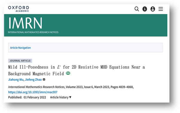 近日,开云kaiyun官网数学与应用数学系赵杰风博士以通讯作者在国际高水平数学期刊《International Mathematics Research Notices》发表论文《Mild ill-posedness in L∞ for 2D resistive MHD equations near a background magnetic field》。