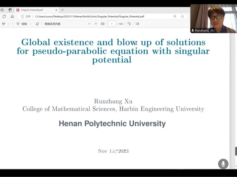 本网讯(通讯员 赵小奎)2023年11月15日15:00-18:00,应开云kaiyun官网邀请,哈尔滨工程大学徐润章教授以线上形式做了关于具有奇异位势的伪抛物型方程解的整体存在性和爆破性的报告。开云kaiyun官网原保全教授主持该学术报告。