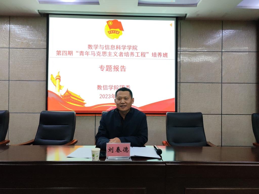 仪式结束后,刘春德以《始终做习近平新时代中国特色社会主义思想的坚定信仰者和忠诚实践者》为题,主讲首场专题报告。他指出,要充分认识实施“青年马克思主义者培养工程”的重大意义,提高站位,把握机会,深学细悟,努力把自己培养成为具有忠诚的政治品格、浓厚的家国情怀、扎实的理论功底、突出的能力素质,忠恕任事、人品服众的青年政治骨干。要坚定共产主义远大理想和中国特色社会主义共同理想,自觉学懂弄通做实党的二十大精神,自觉以习近平新时代中国特色社会主义思想武装头脑,始终做习近平新时代中国特色社会主义思想的坚定信仰者和忠诚实践者。要主动把自己的小我融入祖国、人民的大我之中,勇立时代潮头,争做时代先锋,锤炼品德修为,练就过硬本领,明德任责、好学力行、勤勉求是,拼搏奋斗,笃行不怠,努力成为担当民族复兴大任的时代新人。