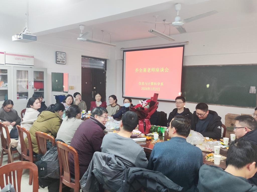 本网讯(通讯员 毋述斐/文 周玲玲/图)1月2日下午,信息与计算科学系为系部荣休教师乔全喜举办座谈会,学院副院长牛海峰、司增艳,党政办、实验中心负责同志,系部教师参加座谈会。信息系教工党支部书记毋述斐主持会议。
