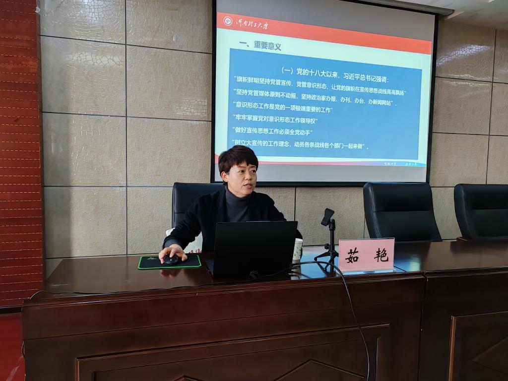 茹艳首先结合党的十八大以来习近平总书记关于宣传思想文化工作的重要论述、相关会议精神,特别是2023年全国宣传思想文化工作会议首次提出的习近平文化思想,深刻阐释了做好党的宣传思想文化工作的重要意义。她深入讲解了新时代党的宣传思想文化工作的“七个着力”,认为大家要按照党中央谋划的宏伟蓝图和实践方法,全力做好新时代新征程宣传思想文化工作。茹艳还从学校和学院的发展实际入手,具体指出二级学院做好宣传思想工作的主要任务。最后,茹艳结合相关文件精神和学校制度要求,从意识形态、思想政治、新闻宣传、精神文明创建等方面,详细指导了开云kaiyun官网在新时代党的宣传思想文化工作中如何做、做得好。