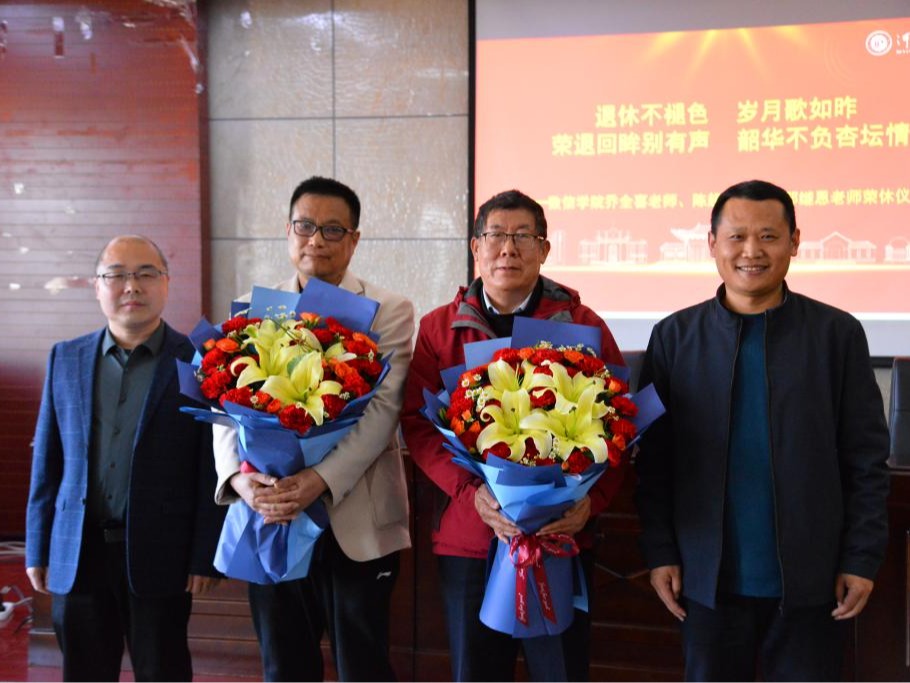 乔全喜老师和陈超平老师作为荣休教师代表在会上发表感言,对学院近年来发展取得的成绩倍感欣慰,对学院热情细致的关心倍感温暖,对学院和全院教职工表达真诚谢意,并表示尽己所能发挥余热,在育人、科研等方面为学院做出更多贡献,鼓励全院教职员工们继续奋勇拼搏、开拓创新,共同推动学院事业实现高质量发展,也表示会一如既往关注、支持学院发展。在雷鸣般的掌声中,学院青年教师为荣休教师们送上精心准备的鲜花,共同为他们庆祝这一重要时刻,祝愿他们永远年轻健康快乐,并感谢他们在工作和生活中对青年教师们的谆谆教诲和悉心呵护,并表示将发扬老教师的优良作风,脚踏实地,认真工作。