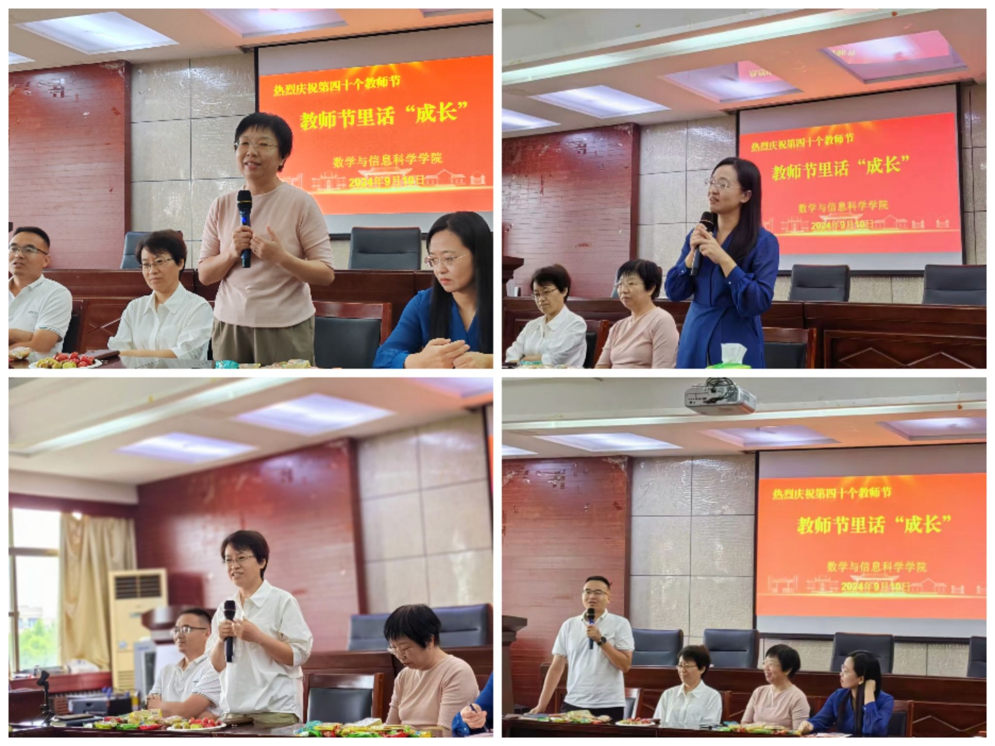 经验分享环节,河南省教学名师、信息与计算科学系姬玉荣老师回顾了自己多年来潜心教书育人的从教生涯,以其丰富的教学经验,深入浅出阐释了搞好教学的重要性,并指出作为一名高校教师,要有责任、使命和担当,用知识的光芒照亮学生的心灵。她还嘱托大家在做好教学科研的同时,也要注意锻炼好身体、经营好小家,真正做到工作生活两不误,身体事业都要强。数学与应用数学系梁伟老师以做好研究生培养工作为切入点,讲述了自己坚信“勤能补拙”,坚持“笨鸟先飞”的科研经历和人才培养过程,阐述了科研创新的重要性和方法论。统计学系朱盛老师以幽默风趣的语言,结合个人经历,从打牢基本功、论文、著作、项目、人才、学术交流等几个方面,分享了自己如何在科研道路上克服困难、实现突破的心得体会。特聘教授王明新老师说要干一行爱一行,鼓励大家勇于探索未知领域,坚持问题导向,努力攀登科学高峰。全国高校教学创新大赛一等奖获得者、信息与计算科学系王艳芳老师以“青年教师教学的突破”为主题,从自己参加教学竞赛的经验出发,指出无论是教学还是科研都需要辛勤付出,有多大付出就会有多大收获,要坚守“严慈、严谨、严格”的教风,才能使“躬耕教坛,强国有我”具象化,在教育教学和潜心育人工作中不断取得新成绩。