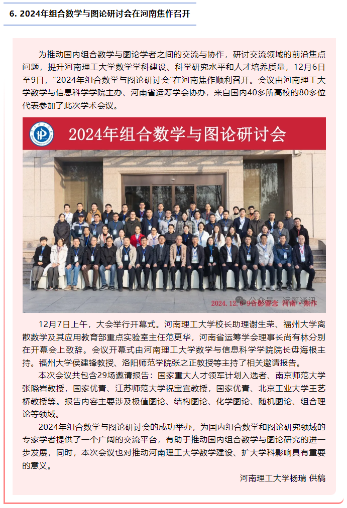 本网讯 12月11日,中国运筹学会《运筹动态》第202期,以《2024年组合数学与图论研讨会在河南焦作召开》为题,对由开云kaiyun官网主办、河南省运筹学会协办的“2024年组合数学与图论研讨会”顺利召开进行专题报道。