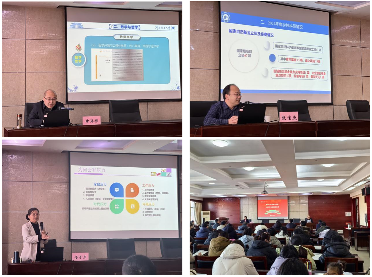 1月13日,院长毋海根以《数学人的教学、科研与人生——兼谈大学教师的知识结构》为主题,通过探讨数学与自然、哲学的关系,深入浅出地讲解了数学不仅是描述世界的工具,更是理解世界本质的重要途径;结合多年的教学科研经验,通过一个个具体案例,为老师们讲授了如何在教学与科研中寻求突破,强调了教学与科研相互促进的重要性。