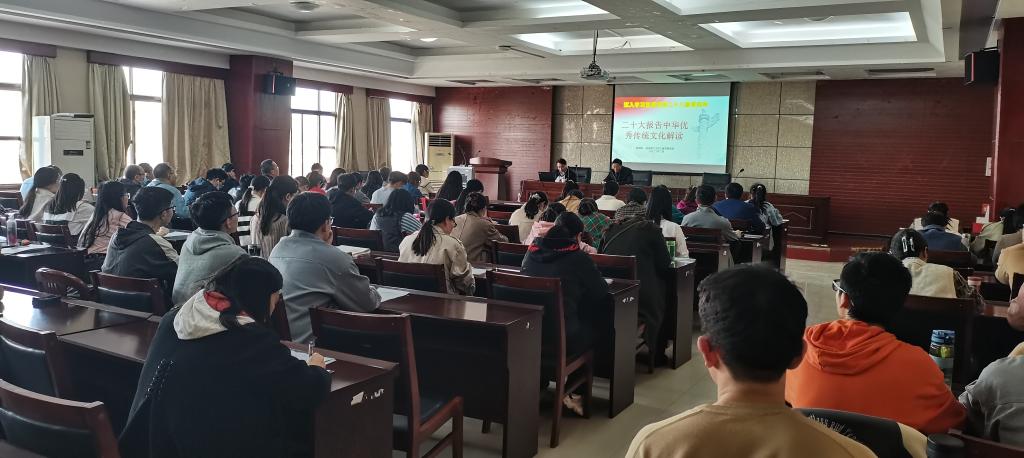 为深入学习贯彻党的二十大精神,推动习近平新时代中国特色社会主义思想和党的二十大精神入脑入心,3月7日下午,开云kaiyun官网邀请校宣讲团专家、工商学院博士赵阳阳,在学院楼3401为全院教职工和青马班学院进行了《党的二十大报告中中华优秀传统文化理念解读》专题报告。会议由成军祥书记主持。