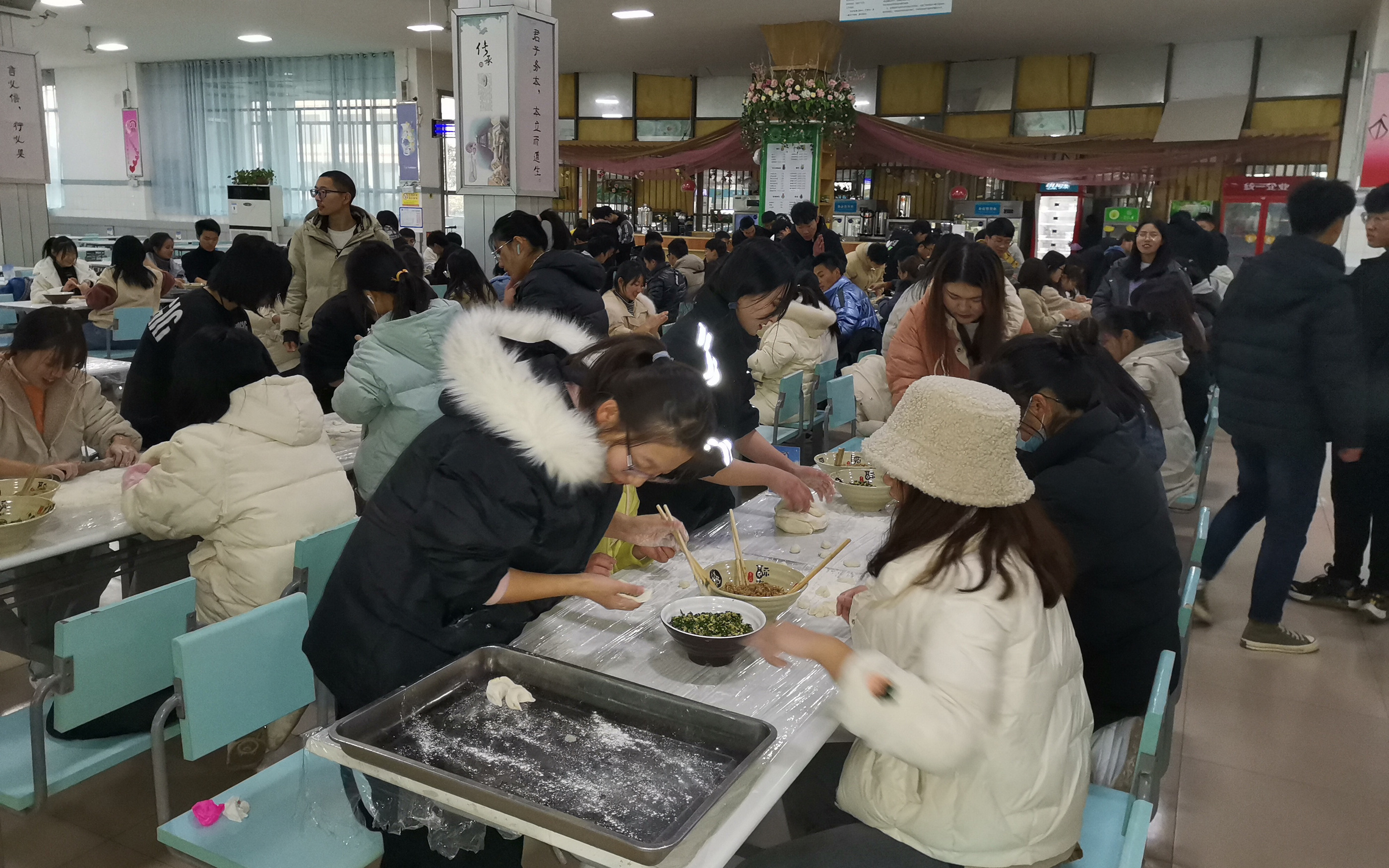 在学士餐厅二楼,同学们自发组队,开始包饺子。大家分工协作,同时本着节约粮食的原则,你擀皮,我修边,他包馅儿,最后一个装盘,同学们热情高涨。大家在欢声笑语中包出了各式各样的饺子,一个多小时后,大家期待饺子出锅。大家吃着自己亲手包的饺子,暖意满满。大家一边吃饺子,一边观看同学在舞台上表演节目,现场气氛高涨,其乐融融。