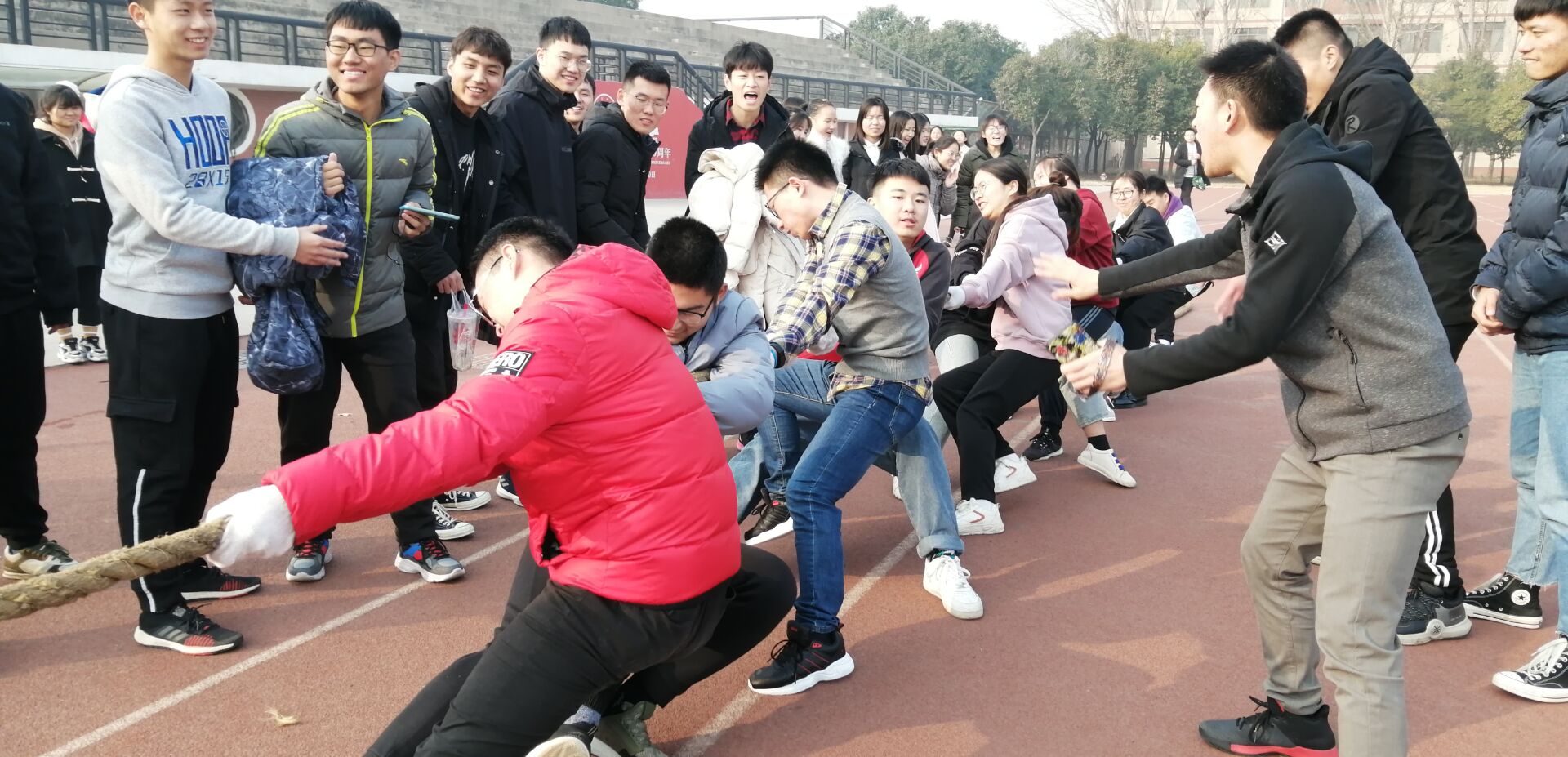 此次团日活动由2019级各团支部策划,年级总团支书翟言玲主持,活动分为拔河比赛、包饺子、趣味运动会三个部分。下午两点拔河比赛在老体育场正式开始,六个班级通过抽签两两比拼,在同学们激烈的呐喊声中,参赛队员们斗志昂扬、激情四射,最终一班夺得桂冠。合影留念之后,由各班负责人带领同学们到学士餐厅二楼开始包饺子活动。在食堂阿姨的指导下,同学们开始包饺子,出锅的饺子各型各状,饺子的的欢声笑香味和同学们语充满了整个餐厅二楼。同学们将餐厅打扫干净,桌椅归回原位后,再次回到老体育场进行趣味游戏活动,由各班负责人组织同学们一起玩游戏。寒冷的夜风冷不了同学们激动的内心,同学们的欢笑声荡漾在体育场上空,青春又温暖。