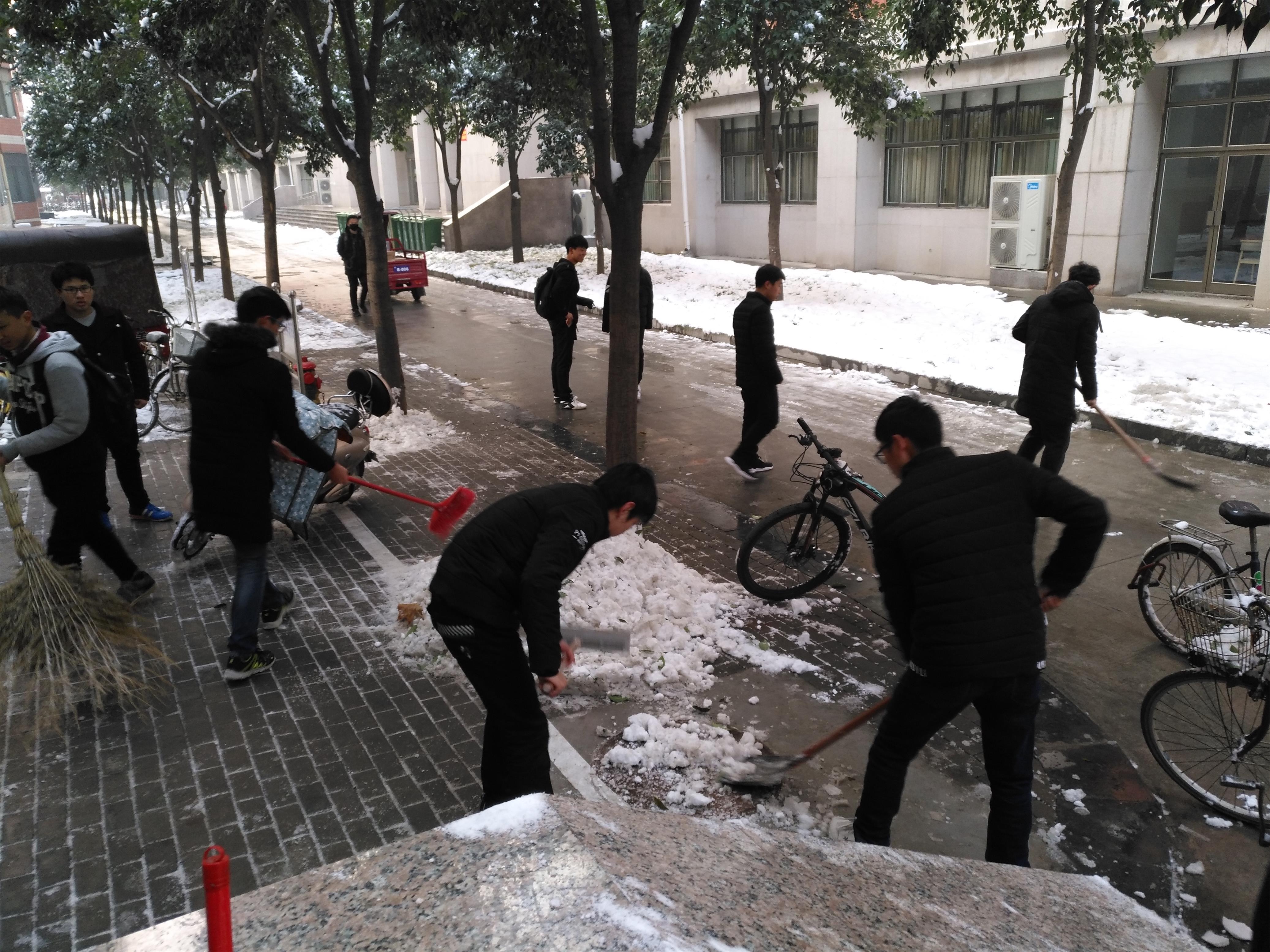 大家分工配合,铲、推、运、扫配合有序、有条不紊。志愿者们不畏严寒、干劲十足、热火朝天,不到两个小时的时间就将学院学生宿舍楼和学院楼附近的道路清扫的干干净净。