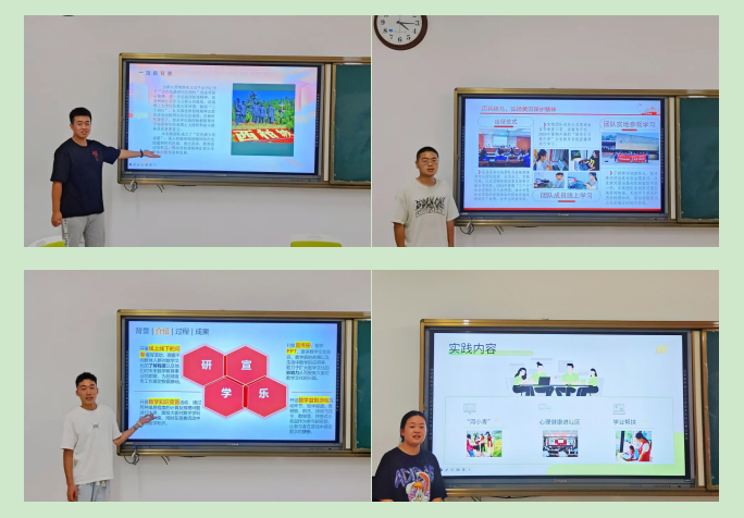 暑期社会实践形式多样、内容丰富,涵盖了社区服务、支教助学、红色宣讲等多个领域。三个实践代表团队进行总结汇报。其中“红色薪火宣讲团”团队代表通过生动的案例,图片展现出了西柏坡精神的伟大,红色文化是我们党和国家的文化根基;“知‘数’达理,‘数’说黄河”团队代表讲述了他们通过走访调查,填写问卷等形式深入了解了黄河的现状,通过向居民们普及黄河保护政策,鼓励更多人关注保护黄河;“数字织梦,减负绘乡”团队代表展示了他们在社区等地方所做的数学文化讲解和游戏互动,让数学应用到日常生活中去。