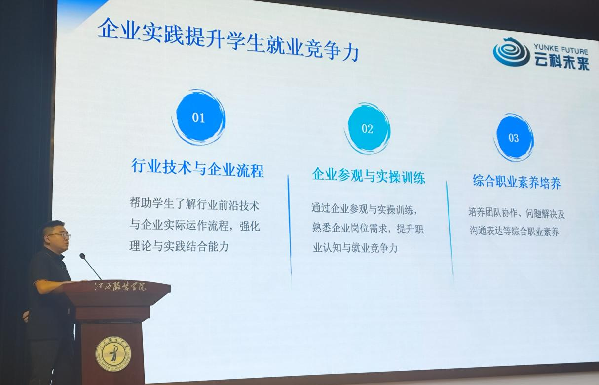 云科未来科技(北京)有限公司对认知实习与专业实习一进行了系统宣讲。内容主要包括实训基地介绍及实习内容说明,实训内容主要涉及软件开发、硬件设备、网络、物联网安全等领域,涵盖团队拓展课程、集训、阶段评比、优秀学员荣誉证书颁发、班级活动、面试指导、项目答辩技巧、一对一模拟训练及结课典礼等环节。另外,对实习期间的管理制度、就业指导服务及课余生活安排等也做了简要说明。