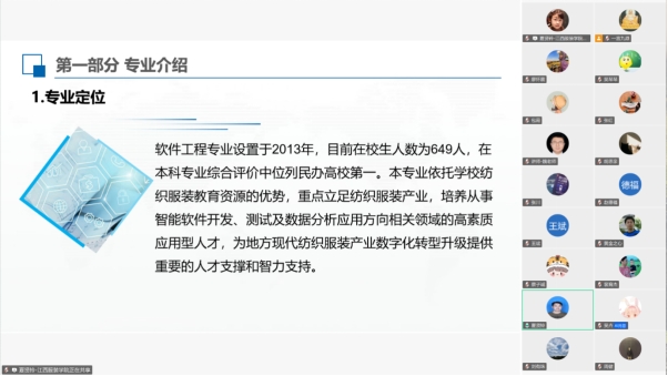 随后,软件工程、数据科学与大数据技术专业负责人分别就专业建设基础与产教融合工作进展进行汇报。在交流研讨环节,参会人员围绕产教融合型品牌专业申报材料的优化完善展开热烈讨论。大家对照专业申请汇报模板,从专业定位与特色、产教融合模式、课程体系构建、实践教学体系、师资队伍建设、社会服务与成果等核心维度逐一梳理,重点聚焦“如何凸显纺织服装+大数据的跨界融合特色”“如何量化呈现产教融合育人成效”“如何进一步深化校企协同机制”等关键问题建言献策。