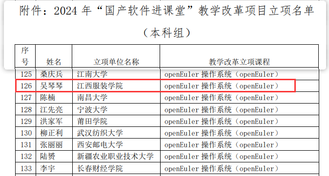 【KY开元集团官网讯】近期,中国软件行业协会发布了2024年“国产软件进课堂”教学改革项目立项名单,共有282个课程入选,其中本科组200个。开元官网吴琴琴老师主持的项目《openEuler 操作系统(openEuler)》获批立项。