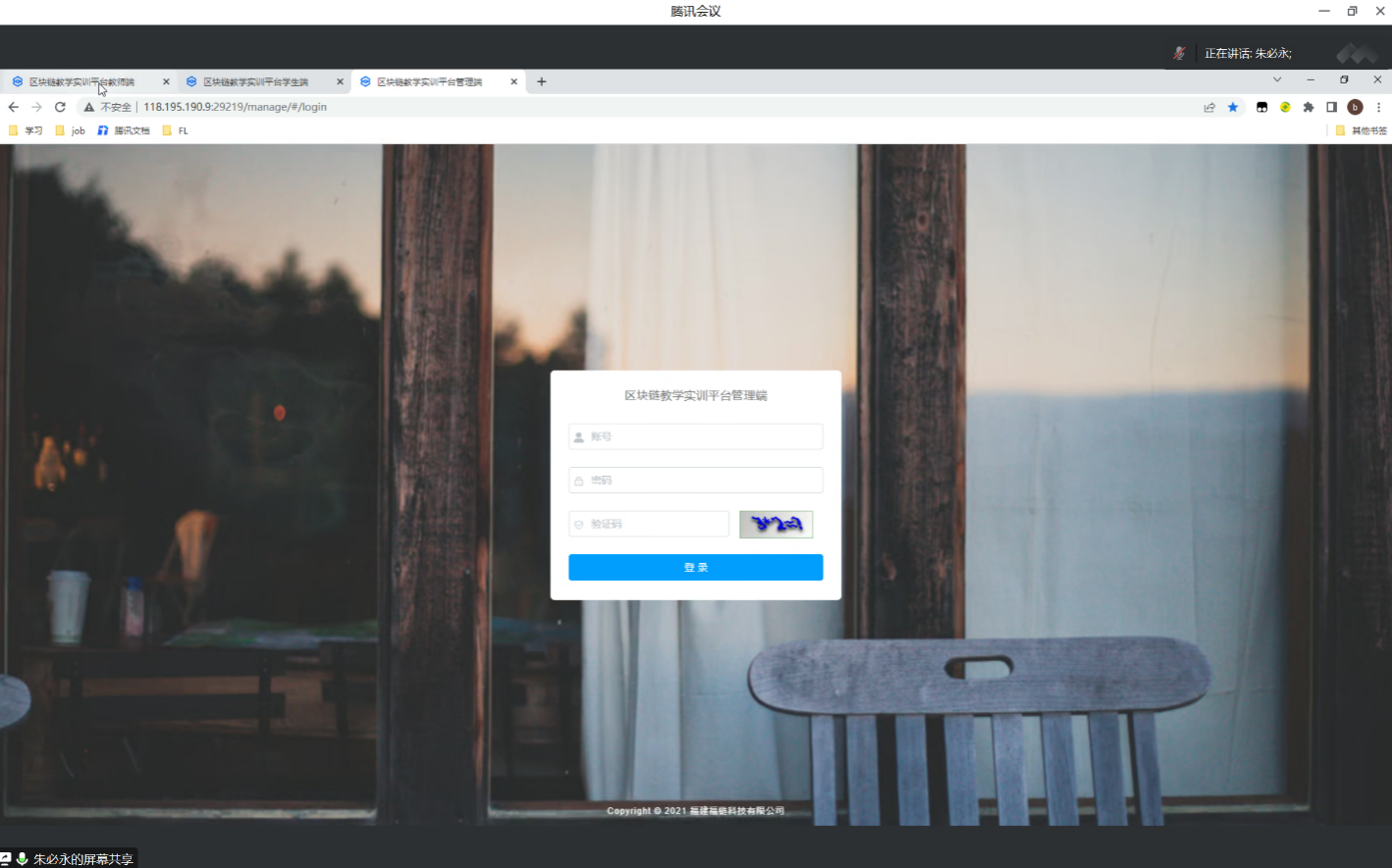 朱必永总经理首先详细介绍了区块链教学实训平台的三种用户端,分别为教师端、学生端和管理端,以及三种用户角色所拥有的功能和权限,并且重点演示了教师角色的权限和功能,接着介绍了区块链实训平台课程设计的计划表。