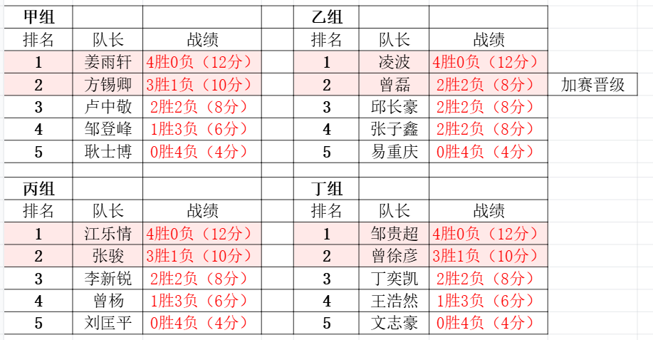 此次比赛一共有二十个队伍大展身手,赛程方面分为小组赛,8强赛,4强赛和总决赛,选手们将在层层选拔中脱颖而出争夺最后的冠军。今天晚上的小组赛,20支队伍共分为甲乙丙丁四个小组,每组5支队伍,小组赛期间胜利积3分,失败积1分。每个小组总积分前两名的队伍,晋级八强赛。经过长达两个多小时的激烈角逐,各个小组的排名如下: