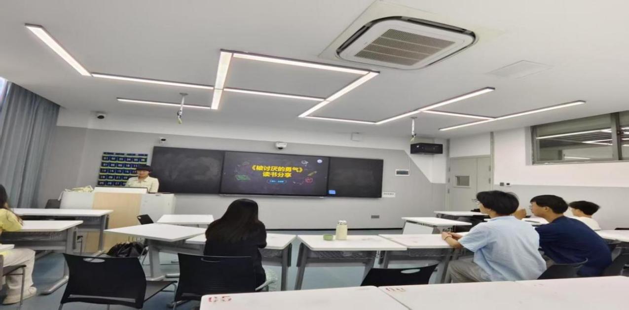 王佳青在分享书籍之前表达自己的性格内向,其次引出自己带来的书籍《被讨厌的勇气》,她表示《被讨厌的勇气》是一本极具启发性的佳作,以哲学对话的形式展开。它打破常规认知,提出“课题分离”这一独特观点,告诉我们要明确区分自己与他人的课题,不为他人期待所累,专注自身生活。书中的“目的论”也别具一格,指出我们当下的行为并非由过去经历决定,而是为达成某种目的。阅读此书,能让我们重新审视自我与人际关系,获得摆脱束缚、勇敢生活的力量,在面对生活困境时,拥有全新视角与应对勇气。