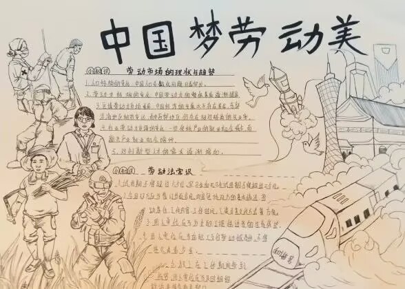 在手抄报创作过程中,同学们深入挖掘劳动的内涵与价值,从不同角度展现了劳动者的风采。有的作品聚焦于身边的普通劳动者,如辛勤耕耘的教师、默默奉献的环卫工人、救死扶伤的医护人员等,用细腻的笔触和真挚的情感,表达了对他们的敬意与感恩;有的作品则通过描绘各行各业劳动者的工作场景,如工厂里忙碌的工人、农田里劳作的农民、建筑工地上挥汗如雨的建筑工人等,展现了劳动的艰辛与伟大,传递出“劳动最光荣”的深刻理念。