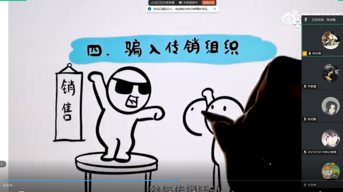 为了让同学们更加直观地了解就业陷阱的危害性和防范措施,班会还组织观看了相关警示视频。视频中通过真实案例的再现,让同学们深刻认识到就业陷阱的多样性和复杂性,进一步增强了大家的风险防范意识。