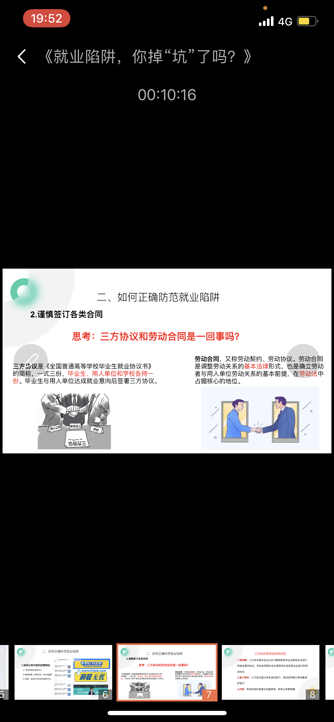 随后,班会进入了三方协议与劳动合同的区别讲解环节。辅导员详细介绍了三方协议和劳动合同的定义、主体、内容、目的及适用的法律等方面的区别。通过对比讲解,同学们更加清晰地认识到两者在就业过程中的不同作用和意义。