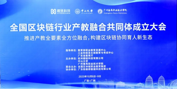 全国区块链行业产教融合共同体成立大会是由杭州趣链科技有限公司、中山大学、广州番禺职业技术学院共同牵头召开,来自全国各地的职业院校、本科院校校领导、二级学院院长和专业教师,多家科研机构、行业协会、企业代表近200人参加会议。