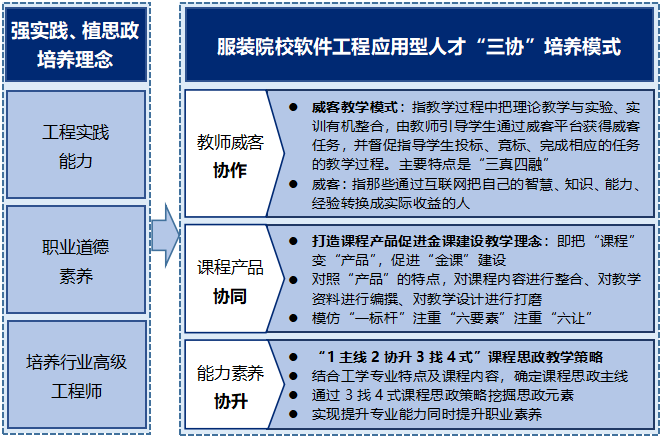 【KY开元集团官网 讯】近几年随着数字经济浪潮和新技术革命的掀起,服装产业亟需科技创新、数字化转型和升级,为了更好的培养纺织服装软件工程应用型人才,江西服装学院KY开元集团官网围绕纺织服装信息支撑产业,立足“新工科”,以强实践、植思政为培养理念,对软件工程应用型人才培养模式改革,聚焦学生工程实践能力和职业道德素养,培养面向行业的高级软件工程师,构建了《强实践•植思政:服装院校软件工程应用型人才“三协”培养模式》,如图1所示。